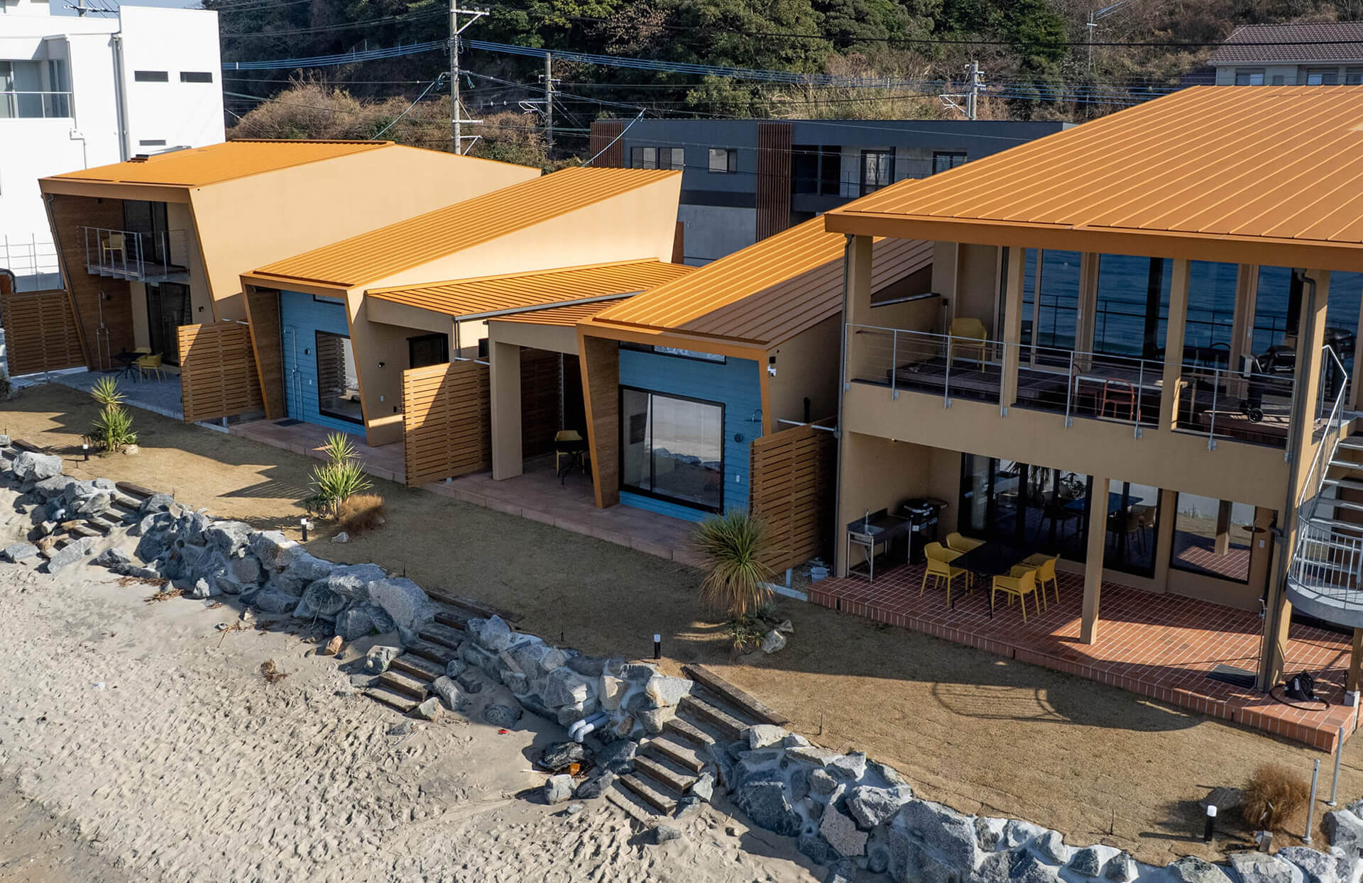 この砂浜に建つ4棟のヴィラでは